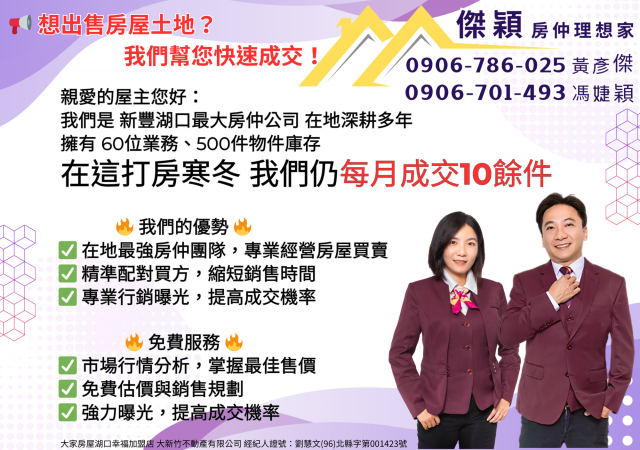 親愛的有緣人您好:歡迎蒞臨 「傑穎房仲」!我們是大家房屋湖口幸福加盟店的 彥傑 與 婕穎。