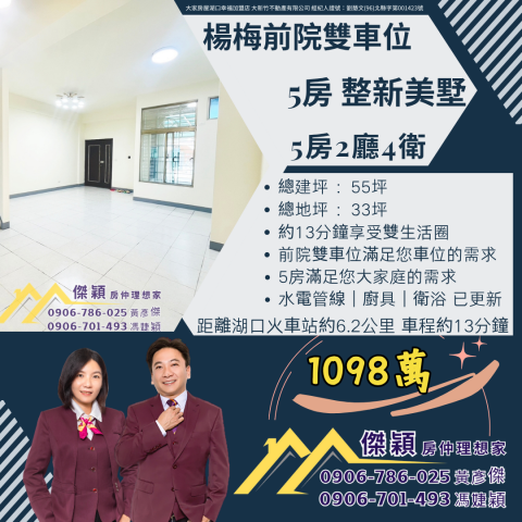 楊梅5房前院雙車整新美透天 湖口土地買賣傑穎房仲