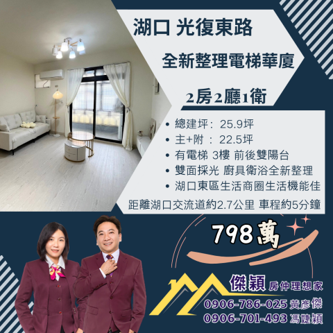 親愛的有緣人您好:歡迎蒞臨 「傑穎房仲」!我們是大家房屋湖口幸福加盟店的 彥傑 與 婕穎。