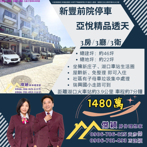 親愛的有緣人您好:歡迎蒞臨 「傑穎房仲」!我們是大家房屋湖口幸福加盟店的 彥傑 與 婕穎。