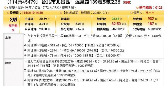 物件資訊內容以登記簿謄本或預售屋買賣契約為準,若有疑問請洽承辦人員。