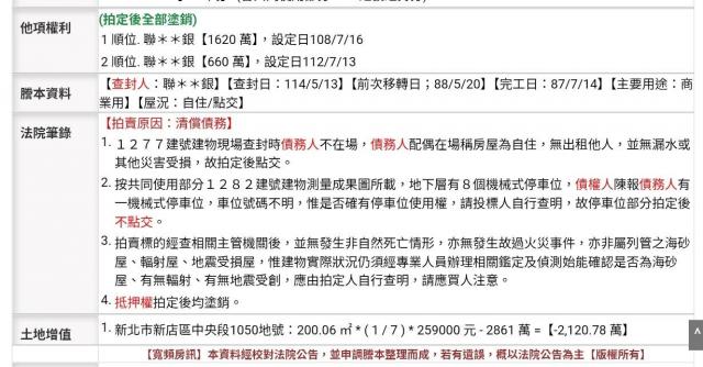 物件資訊內容以登記簿謄本或預售屋買賣契約為準,若有疑問請洽承辦人員。