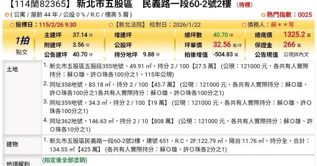 物件資訊內容以登記簿謄本或預售屋買賣契約為準,若有疑問請洽承辦人員。