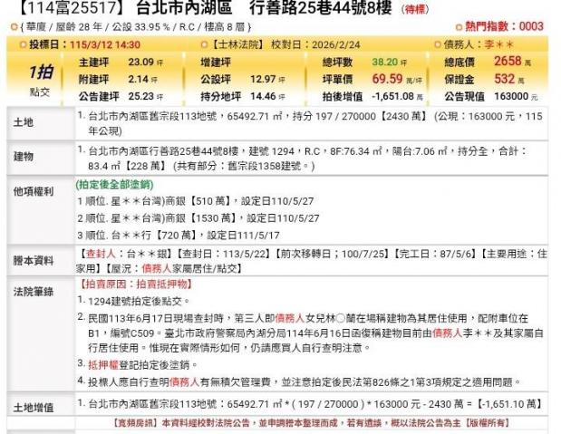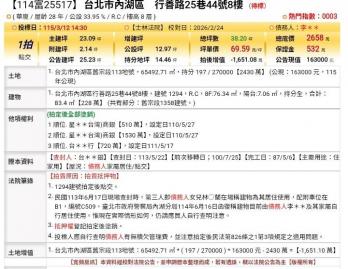 | 優勢 (Strengths) | 價格潛力: 參考單價約為每坪 44.53 萬,相較於內湖區一般市場行情,法拍案通常具有價格優勢,總價 1701 萬元對於 38.2 坪的大戶來說具吸引力。 居住空間: 總坪數達 38.2 坪,屋況若無大問題,適合家庭長期居住或需要多人房舍的家庭需求。 地理位置: 位於台北市內湖區 (郵遞區號 114),屬於生活機能成熟的住商混合區域。 |