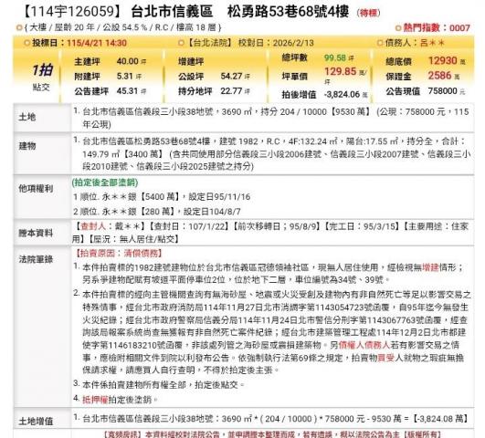 總結來說,這是一個適合「有備而來」之買方的優質物件,能接受高單價與法拍流程的複雜性後,其地段與空間優勢將成為重要的居住或投資價值。