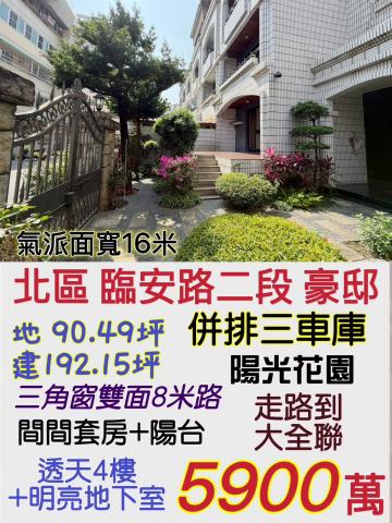 | 優勢 (Strengths) | 1. 空間極大:總坪數達 192.15 坪(含車位),室內格局為 5 房 4 廳 6 衛,極適合大家庭或需要居家辦公者。 2. 地理位置優異:位於北區臨安路二段,鄰近成大與南科生活圈,且為雙面 8 米道路,通行便利度佳。 3. 生活機能成熟:步行即達大全聯超市、超商及和順公園,學區涵蓋立人國小與民德國中,教育資源豐富。 4. 採光良好:三角窗設計加上花園庭院,居住環境通風與採光條件較一般透天佳。 |