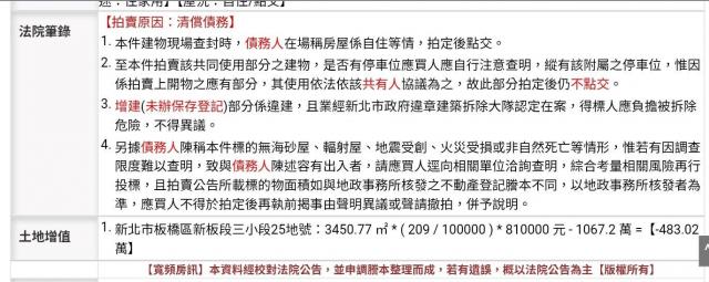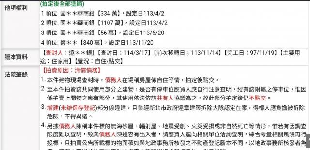 | 威脅 | 潛在隱憂包括原住戶或租客是否會無故拒不遷出(強佔問題);可能有未結清的稅金、管理費等債務需由買方承擔;銀行對於法拍屋貸款審查較嚴,可能影響資金調度。 |
