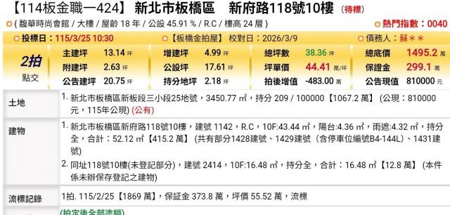 是否值得購買及理由: 此物件適合對法拍流程熟悉、且能承擔潛在風險的購屋者考慮。主要理由是板橋地段價值高,且單價約 31.18 萬在該區域具有競爭力,總價門檻也相對友善。然而,由於缺乏車位且涉及法院拍賣程序,您必須確認自己有能力處理可能的產權清理問題,並準備好短期內繳清尾款的資金調度(含利息成本)。若您是尋求高獲利、願意投入時間精力處理後續事宜的買家,則值得列入優先清單;若您偏好一進場即能安心入住或對流程陌生,建議謹慎評估。