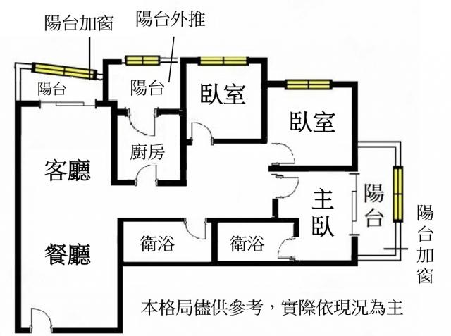 - 格局: 3房(室) 2廳 2衛 3陽台 1廚房