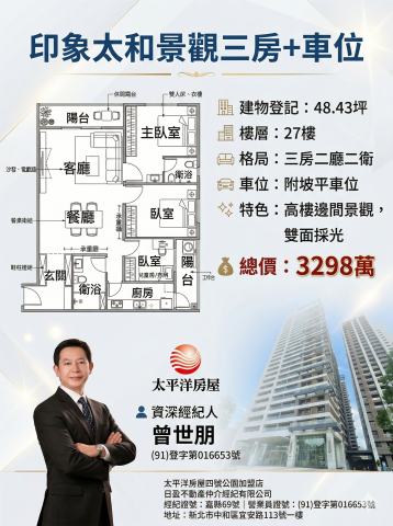 岳哥房產觀察室【印象太和】27F極景邊間三房?附坡平車位