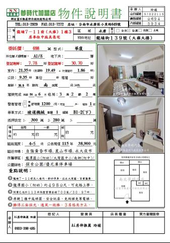物件資訊內容以登記簿謄本或預售屋買賣契約為準,若有疑問請洽承辦人員。