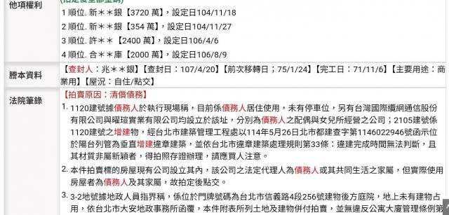 | 劣勢 (Weaknesses) | 使用分區: 土地及建物登記為「商業用」,非一般住戶住宅,相關稅費(契稅、土地增值稅等)通常較高。 付款條件: 屬法院拍賣,得標後需於 7 日內繳清尾款,資金調度壓力極大。 硬體配套: 物件不包含車位,在台北市區停車可能為負擔。 資訊透明度: 法拍屋可能存在隱性債務、產權糾紛或屋內有人占用需處理的問題。 |