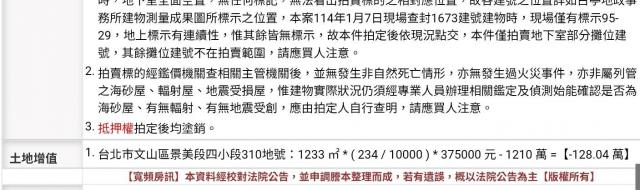 - 持有成本與風險:沒有車位是重大短板,在文山區通勤需考慮停車成本。此外,法拍程序中的資金週轉壓力(7 天清尾款)及較高的代墊利息,要求買家必須有充足的現金流或完善的融資管道。