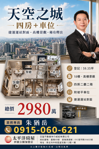 岳哥房產觀察室捷運對面|天空之城・高樓雲端視野四房平車|稀有