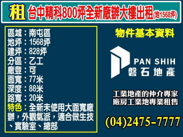 台中精科稀有570坪優質廠辦出租
