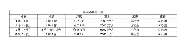 租金包含: 管理費、清潔費、網路、第四台、水費