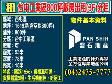 台中工業區800坪廠房出租(3F)分租